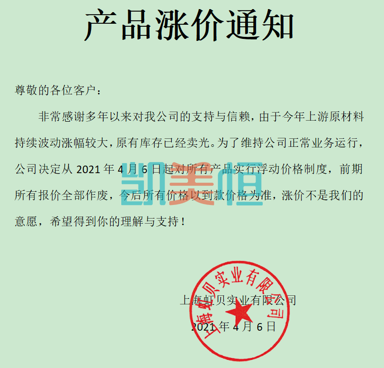 非常感謝多年以來(lái)對(duì)我公司的支持與信賴(lài),由于今年上游原材料持續(xù)波動(dòng)漲幅較大,原有庫(kù)存已經(jīng)賣(mài)光。為了維持公司正常業(yè)務(wù)運(yùn)行,公司決定從2021年4月6日起對(duì)所有產(chǎn)品實(shí)行浮動(dòng)價(jià)格制度,前期所有報(bào)價(jià)全部作廢,今后所有價(jià)格以到款價(jià)格為準(zhǔn),漲價(jià)不是我們的意愿,希望得到你的理解與支持!
