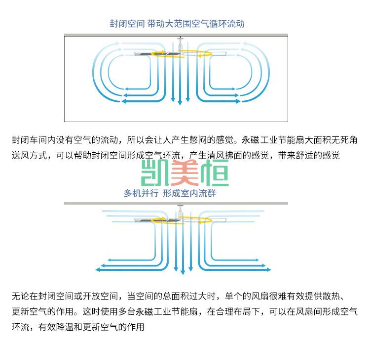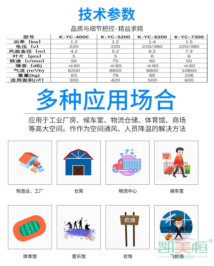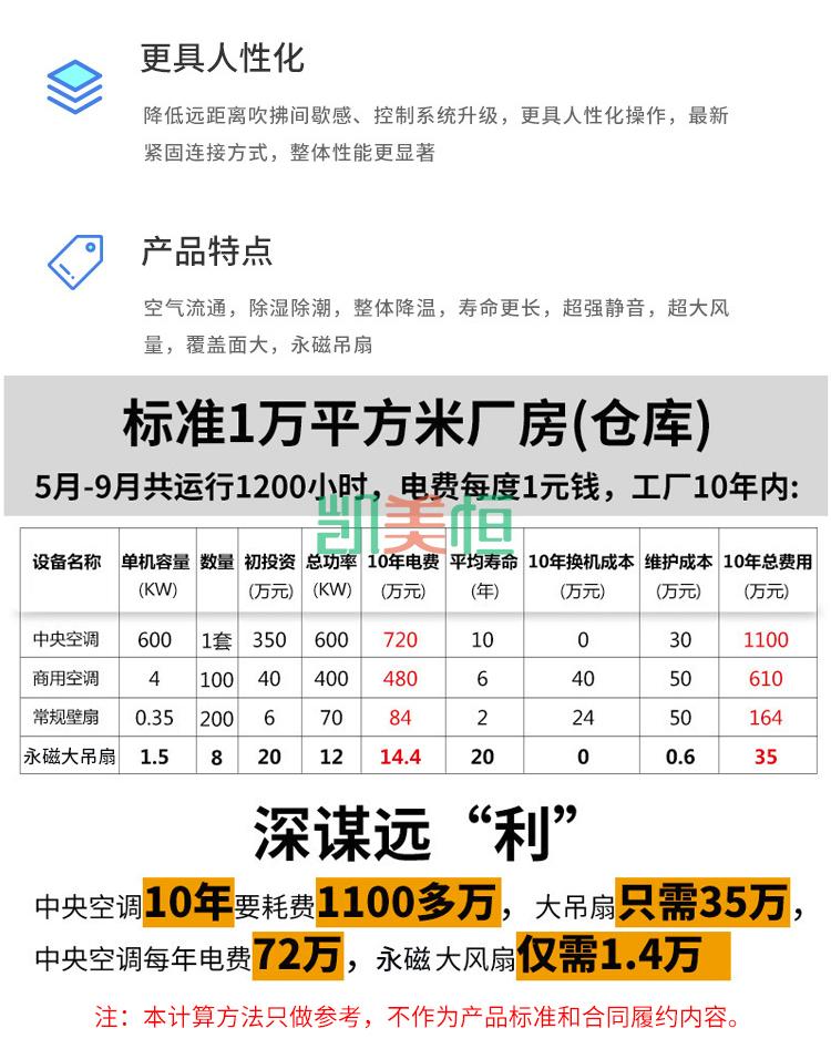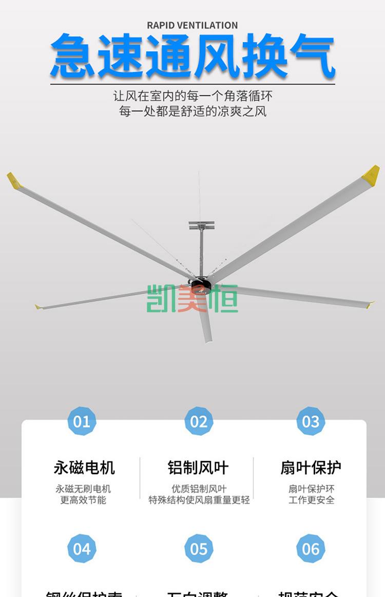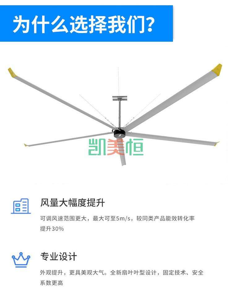 產品描述: 上海凱美恒品牌大型工業吊扇,永磁節能大風扇,工業大風扇,工業大吊扇也被稱為“工業大風扇”最大直徑7.3米,覆蓋面積600平方米,功率1.5KW。可以做到自然通風、超大覆蓋面積,是夏季開放式空間降溫納涼的解決之道。大吊扇即大風扇。大吊扇是專門為節能降耗、改善工作環境舒適度而開發的一系列產品。